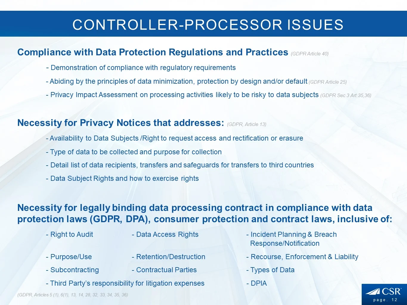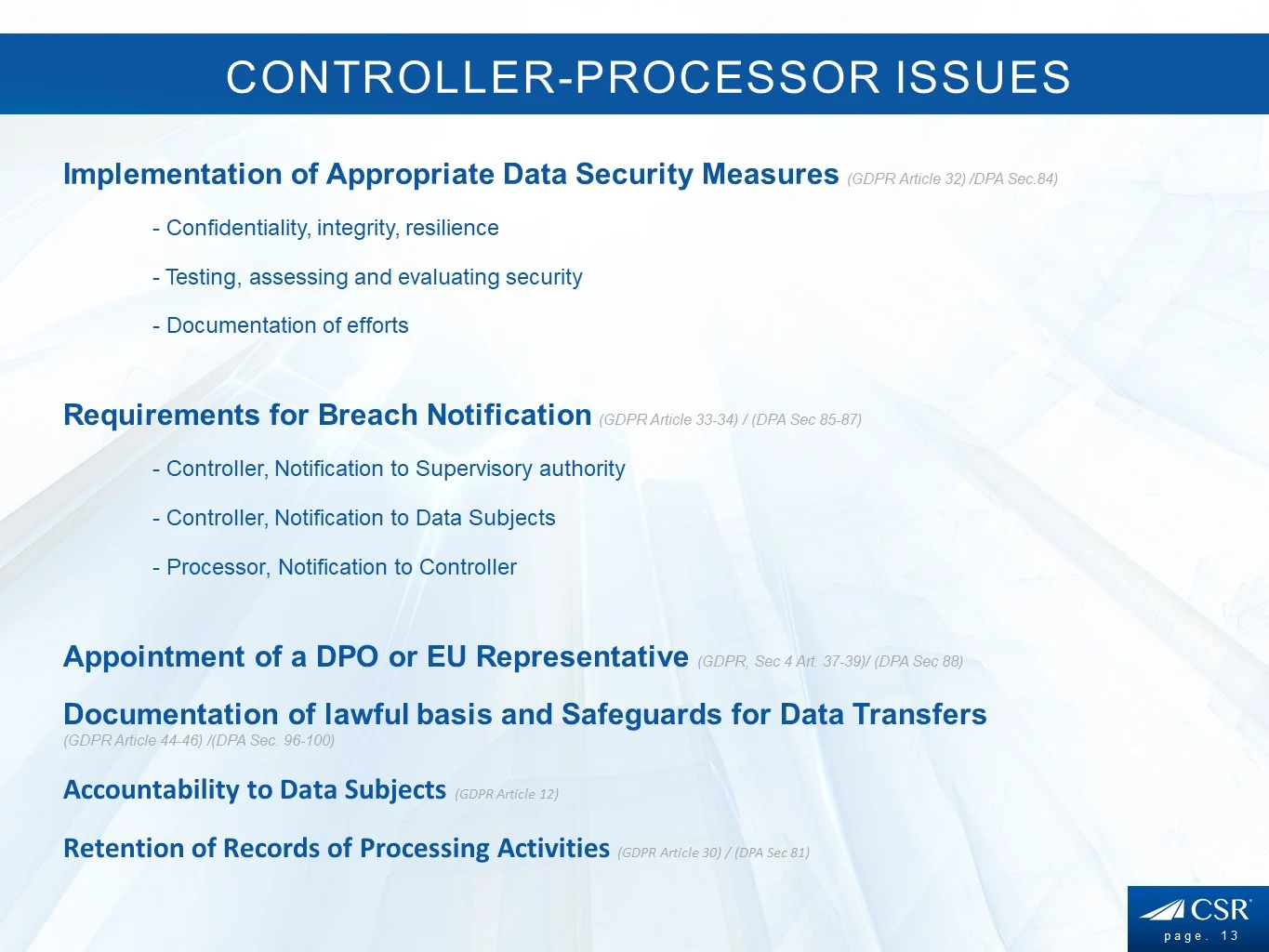Architected, developed and maintained by certified privacy experts, it is THE answer to privacy regulatory compliance for the SMB market. With little to no affordable solutions currently available for the SMB market, CSR Privacy Solutions has created this SaaS privacy solution, offering an easy-to-use gap analytic, sophisticated assessment scoring and custom prioritised list of tasks identified for remediation to help the SMB take necessary steps toward regulatory compliance.